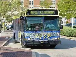 REX began service on September 26, 2004.[5] The REX takes over the southern portion of the 9A, which ran between Pentagon Station and Lorton VRE Station.[4] The remaining portion of the 9A is provided by Fairfax Connector route 171, as the REX ends at Fort Belvoir. The fare of the initial REX route was $1.00, for a one-year demonstration period. The REX runs via the Jackson Loop at Fort Belvoir, although some trips alters via Pohick Road, when the Jackson Loop is closed. When the REX reaches Fort Belvoir, all customers that are on the REX follows the security procedure of Fort Belvoir, as the terminal is a military base. These procedures runs throughout all bus routes that serves Fort Belvoir. In 2008, the alternate terminal of the REX night trips was moved to Woodlawn at Old Mill Road. The night REX trips does not serve Fort Belvoir.[6] In addition to these changes, the REX route adds a Saturday Supplemental trip, where it adds more trips on holiday, when REX runs on a Saturday schedule. The Saturday Supplemental trips operates up to Woodlawn, the same place where the night REX trips ends. Alongside with these changes, the special $1.00 fare was changed to the same fare as any regular Metrobus routes in January, 2009.[7] In 2011, Fort Belvoir open doors to all REX trips, following the opening of Fort Belvoir Community Hospital.[8] REX retained the full route until 2017, when the route was extended to the Fort Belvoir Post Exchange/Commissary.[9] This extension is only effective during weekdays, as the REX does not operate at the Post Exchange/Commissary on the weekends.