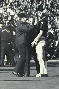 Leach enrolled at the University of Michigan in 1975. A left-hander, he was the Wolverines' starting quarterback from 1975 through 1978 under head coach Bo Schembechler. As an 18-year-old true freshman, Leach started 11 of 12 games and led the Wolverines to an 8–2–2 record and #8 ranking in the final AP poll.[6] He rushed for 552 yards and passed for 680 yards as a freshman. With the Big Ten championship and a Rose Bowl berth on the line in the Michigan-Ohio State game, Leach threw an interception that was run back to the Michigan 3-yard line by Buckeye cornerback Ray Griffin and set up the winning touchdown in a 21–14 Ohio State victory.[7] However, Leach and the Wolverines never lost to Ohio State again in his career.