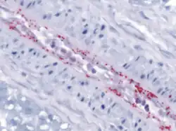 While humans are hosts for R. rickettsii, they do not contribute to rickettsial transmission. Rather, the pathogen is maintained through its vector: ticks. R. rickettsii invades vascular endothelial cells that line both small- and medium-sized blood vessels in the host's body.[18] There is an extensive immune response to this pathogen that triggers different pathways in the macrovascular and microvascular systems.[18] As the cells are damaged there is an increased permeability of the vessels (extravasation), microvascular hemorrhages, and necrosis. Additionally, there is evidence that suggests that R. rickettsii possesses the ability to cross the blood-brain barrier into the host's central nervous system, allowing the pathogen to target the brain's vasculature.[18] The pathogen causes changes in the host cell's cytoskeleton that induce phagocytosis. Consequently, R. rickettsii replicates further and infects other cells in the host's body. R. rickettsii's survival in the immune system cells increases the pathogen's virulence in mammalian hosts.