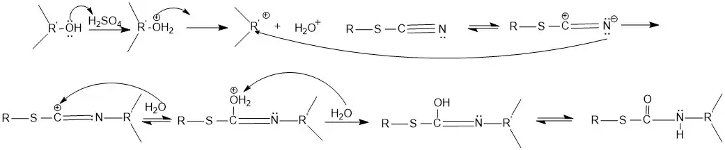 The mechanism for the conversion of an alcohol to the N-substituted thiocarbamate is shown below.[4] The reaction proceeds under acidic conditions. The alcohol accepts a hydrogen ion from sulfuric acid to form a water, which then leaves, creating a carbocation. The mesomeric form of the cyanogroup reacts with the carbocation. The carbocation is attacked by a water, which then loses a hydrogen to form the product. The product then undergoes hydrolysis to form the N-substituted thiocarbamate.