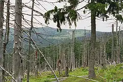 The higher parts form the montane vegetation zone. Their natural coniferous forests have also in large parts been replaced by spruce monocultures, which are often heavily damaged due to air pollution and soil acidification. In many places, the forest is dead. This is due to the geographic location in the Black Triangle, a region around the German–Polish–Czech border triangle with many coal-burning power plants. The sulfur dioxide emissions, which are mainly responsible for acid rain, and the emission of many other concentrations have been greatly reduced since the beginning of the 1990s, but the forest die-back, which started in the 1970s and culminated in the late 1980s, could not be stopped entirely.