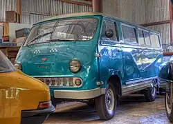 From 1958, the factory started to produce RAF-977 minibuses, based on GAZ-21 Volga engine (between the front seats,[3] rather like the Dodge A100; the engine was accessible through an inside hatch[3]), transmission, axles, and steering.[3] It was planned to produce passenger ("route taxis" for airports, and for sporting teams), freight, mail, and ambulance versions of the vehicle, to replace the modified estates then in use.[2] Drawing inspiration from the VW Type 2, it had a front-mounted water-cooled 2,445 cc (149.2 cu in) engine (based on the Volga's, with a lower compression ratio), and seated ten.[4] It debuted in 1957, and ten were built for display at that year's Moscow Youth Festival, leading to a proposed name Festival.[3] The first batch was produced in 1959, under the new RAF 977 name.[3] It got 13 L/100 km (18 mpg‑US; 22 mpg‑imp) and could reach 62 mph (100 km/h),[3] the majority of those being hand-built.[2]
