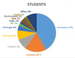 RSU has a student teacher ratio of 1:10. The total number of students for 2024 stands on 12007, while the total number of RSU employees stands at around 1,800, with 370 academic staff members. The language of instruction at RSU is primarily Latvian, however an increasing number of faculties and departments additionally offer programmes in English for international students studying Medicine, Dentistry, Pharmacy, Nursing, Physiotherapy, Public Health, Health Management, International Business and Start-up Entrepreneurship and International Governance and Diplomacy, etc. One third of all international students in Latvia study at RSU and currently international students constitute more than 27% of the student body of the university.[9] In 2022 In 2022 out of 2620 international students 30% came from Germany, 26% from Sweden, 12,5% from Finland and 7% from Norway 4.5% from Italy, 2.4% form India, 2.2% from Portugal, and 2.2% from Israel.[10] In the same year, 88% of foreign students studied in the Faculty of Medicine and 11% in the Faculty of Dentistry. Even though 87% of international students are from the EU/EEA countries, RSU students represent 70 different countries creating an active multicultural study and social environment at RSU. In the same year, 87.6% of international students studied in the Faculty of Medicine and 11.2% in the Faculty of Dentistry.[3] RSU has also developed partnerships with more than 150 Erasmus+ partner universities and welcomes international exchange students form different countries every semester.[10]