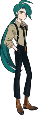 Rika has long green hair, slanted eyebrows, and is tall and slim[12] with long legs.[13] She wears a suit, black gloves, earrings,[12] high-cut boots, and a loose necktie.[13] She is described as having a "cool appearance" while being very friendly.[12] While she speaks formally normally, she speaks more roughly as she becomes invested in a battle.[14] Rika normally speaks with a Kansai-like dialect.[6] When interviewing people, Rika speaks with a "polite, standard Japanese" dialect.[15] In Japanese, she refers to herself in the third person at times and calls herself "Chili-chan."[14]