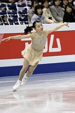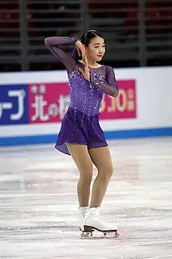 Kihira was chosen to represent Japan at the 2021 World Championships, where she was rated as a contender for the title alongside the top Russian skaters.[51] She placed second in the short program after her triple Axel and toe loop were a quarter of a rotation short.[52] In the free skate, Kihira doubled her first attempt at a triple Axel, fell on an underrotated second attempt, and underrotated two other jumps, finishing ninth in that segment and dropping to seventh place overall.[53] Her placement, combined with that of Sakamoto, who finished above her in sixth, qualified three ladies' berths for Japan to the 2022 Winter Olympics.[54]