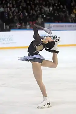 Her next competition was Skate Canada, where she placed first after a clean short program scoring 81.35.[27] In the free skate, Kihira stepped out of her first triple Axel but had a clean skate after that. She earned 148.98 points in the free skate to score 230.33 overall and finish second overall behind Alexandra Trusova, who landed three quad jumps in her free skate.[28] Kihira stated afterward that Trusova's performance motivated her to work to increase her scoring potential in the future.[29] Competing at the 2019 NHK Trophy, Kihira landed her Axel and combination cleanly but had a poor landing on her triple loop, placing second behind Alena Kostornaia, who also performed a triple Axel and broke Kihira's short program world record.[30] Having also finished second in the free skate, she won a second silver medal and qualified for the Grand Prix Final.[31] Kihira stated afterward that her ankle continued to be a problem after three months, with the possibility that it might be a tendon issue that would require time away from competition to heal.[26]
