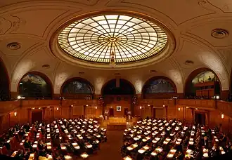 The Swedish word riksdag, in definite form riksdagen, is a general term for "parliament" or "assembly", but it is typically only used for Sweden's legislature and certain related institutions.[4][5][6] In addition to Sweden's parliament, it is also used for the Parliament of Finland and the Estonian Riigikogu, as well as the historical German Reichstag and the Danish Rigsdagen.[6] In Swedish use, riksdagen is usually not capitalised.[7]Riksdag derives from the genitive of rike, referring to royal power, and dag, meaning diet or conference; the German word Reichstag and the Danish Rigsdag are cognate.[8] The Oxford English Dictionary traces English use of the term "Riksdag" in reference to the Swedish assembly back to 1855.[8]