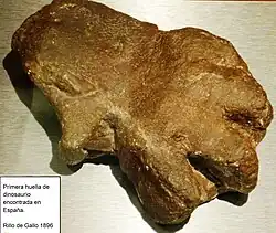Rillo de Gallo was the first place in Spain where a dinosaur footprint was found. The discovery took place in the year 1896 when a local resident found "the stone foot of a bug". The scholars of the time described it as "a petrified leg of a corpulent animal" and identified it as that of a Chirotherium.[6] The specimen can be found in the Vertebrate and Prehistory Paleontology Collection of the National Museum of Natural Sciences. A sample of the evidence of the existence of reptiles in the fossil record is the traces of the Triassic found in the Museo Geominero in Madrid.