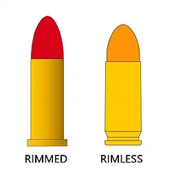 On a semi-rimmed case the rim projects slightly beyond the base of the case, though not as much as a rimmed cartridge. The tiny rim provides minimal interference feeding from a box magazine, while still providing enough surface to headspace on. Semi-rimmed cases are less common than the other types.[4]