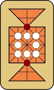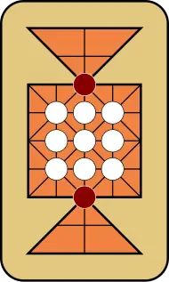 - Nine orang pieces are initially placed on the nine intersection points of the central square of the alquerque board, leaving 26 nodes unoccupied.