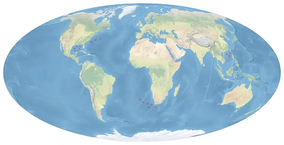 In the Gulf Stream ring shedding takes place at two locations: in the Gulf of Mexico and along the eastern coast of the United States.[1] The Loop current, as its name suggests, loops into the Gulf of Mexico. At the point of retroflection, ring shedding results in both warm core anticyclonic and cold core cyclonic rings.[1][4] These rings can have diameters up to 400 kilometres (250 mi) and reach depths of 1,500 metres (4,900 ft).[1] The frequency of the ring shedding in the Loop current has a high interannual variability.[12][13] However, a shift in the regime of ring shedding has been observed. During the period 1980–1999, there were on average 18 rings shed in the Gulf of Mexico per year, whereas the average between 2000 and 2017 was 33 rings per year.[6] The underlying geophysical reason for this shift in regime around 2000 is still a topic of debate.