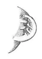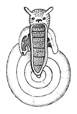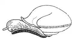 | A drawing of a preserved specimen of Ringicella ringens showing how the snail carries the shell with the spire pointing downwards | |