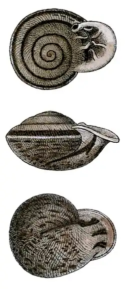 The adult snails in this genus carry their shells upside down, with the spire or apex at the bottom, and the umbilicus at the top.[1]