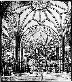The Ringkirche was the first Protestant church in Germany to follow the Wiesbadener Programm, which focused on a clear view from every seat to the combined altar, pulpit, organ and choir areas.[1] It was built between 1892 and 1894 and designed by Johannes Otzen, one of the authors of the Wiesbadener Programm.[2] The hall is a Zentralbau of a type which became a model for Protestant church buildings until the end of World War I.[1] It was consecrated in 1894, seating 1,100 people. Its organ was built by Walcker, with a Romantic disposition,[3] of which 75% is again intact today.[2] The organ was modified to a neo-Baroque disposition in 1949, but restored to its original disposition by major restoration from 2015, leaving not one of the c. 1,800 pipes untouched. Around a quarter of them were replaced. and the others were repaired.[4]