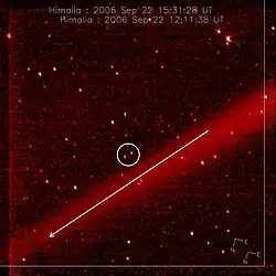 In September 2006, as NASA's New Horizons mission to Pluto approached Jupiter for a gravity assist, it photographed what appeared to be a faint, previously unknown planetary ring or ring arc, parallel with and slightly inside the orbit of the irregular satellite Himalia. The amount of material in the part of the ring or arc imaged by New Horizons was at least 0.04 km3, assuming it had the same albedo as Himalia. If the ring (arc) is debris from Himalia, it must have formed quite recently, given the century-scale precession of the Himalian orbit. It is possible that the ring could be debris from the impact of a very small undiscovered moon into Himalia, suggesting that Jupiter might continue to gain and lose small moons through collisions.[34]