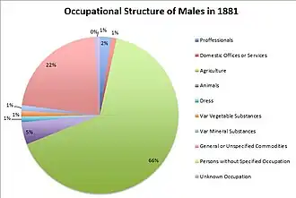 The graph of male occupation structure in 1881, shows that 66% of males are employed in agricultural services, 22% in domestic office or services and 5% are working with animals. This shows that Ringshall was quite primary product dependant, as a large percentage of the population worked in this sector.[7]