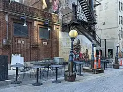 The one-story building has a limestone foundation and exterior walls of brick with recessed brick panels.[9][7] The building's cornice sits above stone shield-shaped elements, appearing to support the cornice.[7] Above the cornice is a brick parapet topped with a stone coping.[6] The structure's entrance is made of stone and faces the alley at an angle, with double wooden doors with original stained glass below a narrow archway decorated with carved stone grapes and vines, as well as the etching "Cafe & Rathskeller", lit with electric bulbs.[5][9][7] The building was designed in the Arts and Crafts style, popular at the time.[3] It celebrated handmade works, and thus Ringside includes intricate tiled floors, some with mermaid depictions, storybook-style stained glass windows from Belgium, and dark wood carvings and features.[3][14] The interior has an intimate scale and warm appearance, similar to an English pub.[9]