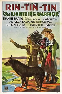 Although primarily a star of silent films, Rin Tin Tin did appear in four sound features, including the 12-part Mascot Studios chapter-play The Lightning Warrior (1931), co-starring with Frankie Darro. In these films, vocal commands would have been picked up by the microphones, so Duncan likely guided Rin Tin Tin by hand signals.[21] Rin Tin Tin and the rest of the crew filmed much of the outdoor action footage for The Lightning Warrior on the Iverson Movie Ranch in Chatsworth, Los Angeles, known for its huge sandstone boulders and widely recognized as the most heavily filmed outdoor shooting location in the history of the movies.[22]