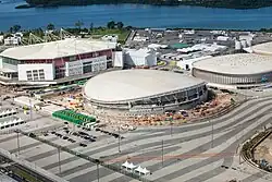 The Barra Velodrome, one of three venues built as part of the City of Sports Complex in Barra da Tijuca for the 2007 Pan American Games, was originally planned to host cycling events for the 2016 Summer Olympics and Paralympics. In early 2013, the International Cycling Union (UCI), the governing body of sports cycling, deemed the velodrome as unsuitable for hosting Olympic events, citing pillars obscuring the view of spectators and judges, and cyclists' inability to reach significant speeds on the track.[5] The cost of upgrading the venue to UCI standards was projected to be as great as building a completely new venue,[6] and thus it was decided that the Barra Velodrome was to be demolished in favour of building a new one at a different site in the park.[7] After the Barra Velodrome was demolished, work on the Rio Olympic Velodrome began, with British firm 3D Reid, who designed the Commonwealth Arena and Sir Chris Hoy Velodrome for the 2014 Commonwealth Games, was chosen alongside Rio de Janeiro-based firm BLAC Architects to help advise design development of the Velodrome.[8][9] Tenders to construct and operate the venue were opened in October 2013 and won by Brazilian engineering firm Tecnosolo S.A, at a budget of R$136.9 million.[5] The cost did not include the budget for track installation, which was to be the responsibility of the Olympic Organizing Committee.[5] The dismantled velodrome was to be given to Goiânia before the city reconsidered due to the high maintenance costs, and the structure were eventually sent to the city of Pinhais, where they wound up unused for years.[10] Only in 2019 the project for a sports complex centered around the velodrome started, with construction advancing by 2021.[11]