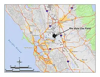 The Rio Vista Gas Field is a large natural gas field in the Sacramento–San Joaquin River Delta in northern California, adjacent to Rio Vista, California. Discovered in 1936, and in continuous operation since, it has produced over 3.6 trillion cubic feet (100 km3) of gas in its lifetime, and retains an estimated reserve of approximately 330 billion cubic feet (9.3×109 m3).[1] In 2008 alone, the most recent year for which data was available, it produced 18 billion cubic feet (510,000,000 m3) of gas. Spanning portions of three counties and covering over 29,000 acres (120 km2), it is the largest natural gas field in California, and one of the fifteen largest in the United States.[2][3][4]