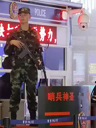 A riot shotgun is a shotgun designed or modified for use as a primarily defensive weapon, by the use of a short barrel and sometimes a larger magazine capacity than shotguns marketed for hunting.[1][2] The riot shotgun is used by military personnel for guard duty and was at one time used for riot control, and is commonly used as a door breaching and patrol weapon by law enforcement personnel, as well as a home defense weapon by civilians.[3][4] Guns of this type are often labeled as breaching shotguns, tactical shotguns or special-purpose shotguns to denote the larger scope of their use; however, these are largely marketing terms.