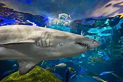 The aquarium holds 5.7 million liters (1.5 million gallons) of water and shows marine and freshwater habitats from around the world.[7] The aquarium is organized into ten galleries: Canadian Waters, Rainbow Reef, Dangerous Lagoon, Discovery Centre, The Gallery, Ray Bay, Swarm: Nature by Numbers, Planet Jellies, Life Support Systems and the Shoreline Gallery. It is home to more than 20,000 animals.[1]