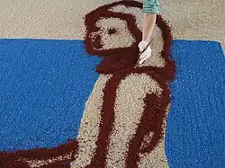 The production of the mosaic is a long and complicated process that requires precision and patience. Every year the project starts with the invitation of some selected artists, whose task is to create a stub: usually a drawing or a painting or just criteria for the production of the mosaic. The artist's work is then enlarged and copied on the support 2 metres square. The next step is the colouring of the rice, in the various colours and tones needed, dipping it into a bath of aniline, acrylics or enamel paints. Sometimes, to make the final work fit to the original artist's project, it has been necessary to use extraordinary types of colouring (carbon, nacre, glitter). The rice, dried and covered with a protecting varnish, is then stuck on the support. Lastly there is a finer colouring made using brushes or airbrush, or particular colours; sometimes the artist themselves comes to refine and complete the work.
