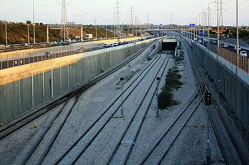In 2005, works began on the construction of Route 431, a limited-access freeway connecting Rishon LeZion with Modi'in.[5] Traffic lanes were built on either side of both the Be'er Ya'akov–Rishon LeZion and Anava–Modi'in railways, incorporating the existing rail tracks into the new highway median, in a manner similar to Ayalon freeway-railway in central Tel Aviv. The highway was additionally designed to accommodate a dual-track railroad in its median for much of its length, guaranteeing right-of-way to extend and connect these two sections and thus creating the potential for a new contiguous Rishon LeZion–Modi'in corridor.