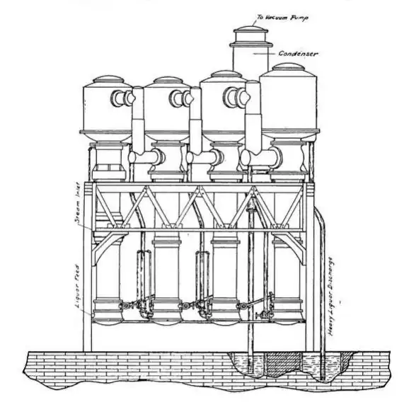 Semi Kestner, also known as Semi-Rising Film Evaporator, is widely used in sugar industries. This equipment provides Polly-baffle catcher to avoid juice entrapment and there would be more effective juice distribution by means of juice coil and Flushing of juice. This design has high brix of syrup and high vapour pressure is supplied as less steam quantity is required.[8] With short retention time of liquor and good heat transfer design features, the juice flows back without any discharge by going through the heating surface only once.[9]