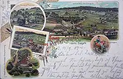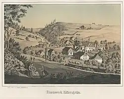 The 19th century was characterized by the decline of the hammer industry and the emergence of new branches of industry. In 1812, only 51 people were still working in the two hammer mills.[16] In 1818 and 1819, two lace-making schools were founded in Rittersgrün, where children learned the craft, which was mainly used by women as a sideline. At this time, ironworking in Rittersgrün was becoming less and less important, partly because it could not compete with the modern businesses in Westphalia and England.[17] In the 1840s, the two hammer mills became the property of Nestler & Breitfeld, who introduced blast furnace operations and converted production. The decline in mining, ironworking, forestry and lace-making led to the impoverishment of the population, which reached its peak in 1846 and 1847 with a famine and outbreaks of scarlet fever and smallpox. A report by the Rittersgrün pastor Moritz Heinrich Rosenhauer, who was elected to the Saxon state parliament shortly afterwards, on the adverse conditions in his parish was published in the Leipziger Illustrirte Zeitung in March 1847.[18] The hardship was alleviated by state grants and private donations in kind and money and the founding of relief and workers' support associations. After the merger of Ober-, Unter- and Hammerrittersgrün to form the municipality of Rittersgrün in 1856, new industries were established. The buildings in Arnoldshammer were used as a wood grinding shop, wood pulp factory and board cutting shop. Daniel Simon Junghans, a tanner from Raschau, together with the lace merchant August Wenzel, founded a wood grinding shop on the site of the former Schmertzing'schen Hammer and converted it into a cardboard factory. Two sawmills emerged from the Schmertzing hammer buildings a little further upstream. Carl Ludwig Flemming, the son of a brush maker from Schönheide, founded a wooden goods factory in Oberglobenstein in 1864, which is still in operation. The opening of the Pöhlatalbahn in 1889, a narrow-gauge railroad that connected Rittersgrün with Grünstädtel on the Annaberg-Buchholz-Schwarzenberg line, simplified the transportation of products from the Rittersgrün businesses and helped to open up Rittersgrün to tourism.
