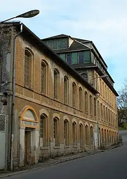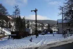 In the early years of the 20th century, the municipality's infrastructure was improved. In 1912, Rittersgrün was connected to the electricity grid. With the construction of today's Karlsbader Straße on the slope of the Unterrittersgrün district, traffic was routed out of the narrow valley. The First World War, in which over 100 Rittersgrün residents were killed, and the inflation up to 1923 had a severe impact on the Rittersgrün economy.[19] Many Rittersgrün residents found work in the metal industry in Schwarzenberg during the 1920s. The construction of new industrial plants also created more jobs in Rittersgrün. The stocking factory built in 1911 by the Krefeld company Huppertz and Feltgen employed only women, apart from the manager. It was operated after the Second World War, including as VEB Kinderbekleidung Modesta, with more than 100 female workers. The JUNGHANS SÖHNE factory was also one of the main employers, employing up to 200 workers in the 1930s.[20] During the Second World War, the industrial companies in Rittersgrün were converted for war purposes, which led to high profits for the local entrepreneurs.[21]