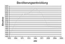 Exact figures on the population development in the early days of the settlement are not known due to the poor availability of sources. What is certain is that the population increase in the first centuries was mainly due to the influx of workers in the hammer mills and surrounding mines. The first reliable indication of the number of inhabitants in all three parts of Rittersgrün is a family list from 1701, according to which around 115 families lived in Rittersgrün at this time, the majority of whom were economically dependent on the hammer mills.[26] Almost a quarter of all heads of household worked as miners, ten woodcutters and six charcoal burners worked in the forest, hammer smiths, blast furnace workers, coal cutters, carters and day laborers ensured the operation of the hammer mills. Overall, living conditions were poor for the majority of the population. Infant mortality was high and incomes were low. Older inhabitants in particular had to work as day laborers, some women earned some extra money by making lace, and at least five people lived as beggars in the village. Due to the flourishing hammer mill business, the number of inhabitants rose sharply over the course of the 19th century.[27] By 1834, it had risen to over 2000 and reached its peak of almost 3000 inhabitants in the middle of the 20th century. Since then, the number of inhabitants has fallen due to the decline in the birth rate and, since the fall of communism and the peaceful revolution in the GDR, the exodus of young people. Before the incorporation into Breitenbrunn, the population was around 1,800. In 2009, just over 1,600 people lived in Rittersgrün.