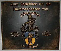 In the Middle Ages, the Pöhlwasser formed the border between the Schwarzenberg dominion and the estates of the Lords of Schönburg to the east. Along the stream was the Rittersgrüner Pass, which crossed the Ore Mountains ridge and, for chroniclers, was an indication of early settlement in the area.[8] The 750th anniversary of Rittersgrün was celebrated in 2000. It is doubtful that a settlement actually existed in the area of today's municipality as early as the 13th century and cannot be proven. The first settlement of the later Rittersgrün is probably closely linked to the construction of a hammer mill on the Pöhlwasser in the 15th century. In 1748, Johann Paul Oettel reported that "Jacob Kleinhempels, who without fault in 1440, worked on the hammer mill at Rittersgrün".[9] It is not known whether this hammer mill and the associated buildings already had a name. It was not until 1534 that Rittersgrün was mentioned in a tax list of the Schwarzenberg office as the name of the first house on the left side of the Pöhlwasser. Where the name Rittersgrün came from and whether it was possibly used for the right-hand side of the stream cannot be determined due to the poor source situation. A few years later, two new hammer mills were built on the right bank of the Pöhlwasser. Hans Schwarz, the mayor of Annaberg, had a "new hammer, on the Behlwasser with a Renwergk" built on the site of today's church.[10] The statement "Undt seint daruber drey wüste Hammerstede und darunter auch eine" suggests that a lively iron processing operation was already underway beforehand. Hans Kleinhempel's hammer was built a little further downstream, presumably on the site of Jakob Kleinhempel's hammer mill mentioned by Oettel.[11] Named Arnoldshammer after a later owner, it remained an independent estate district until the 20th century. At the end of the 16th century, the hammer master Nikolaus Klinger moved a blast furnace to Rittersgrün and thus formed the basis of another hammer mill, which was named the Schmertzingischer Hammer after his son-in-law and successor Rudolph von Schmertzing.