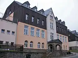The oldest church register of the parish mentions a schoolmaster in Rittersgrün as early as the end of the 17th century. It is not known whether a school building already existed at this time. What is certain is that in 1832 a new school building was erected near the church to replace a building that had been demolished in 1830. In the mid-1830s, around 200 pupils were taught in two classes each by a girls' and a boys' teacher. For capacity reasons, further school buildings were opened in the upper part of the village and on the Hammerberg in 1851 and 1878 and the number of teachers was increased. In 1905, a central school building for all pupils in Rittersgrün was inaugurated above the railroad station. In the year of its opening, six teachers were responsible for 541 pupils. A further education school and a vocational school for women were also attached to the school. From the 1960s onwards, pupils from Tellerhausen also had to attend classes in Rittersgrün, which made an extension necessary,[40] which was completed in 1971. Since then, the school has been run as a Polytechnic Secondary School. After the collapse of the GDR, it initially housed a primary and secondary school.