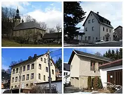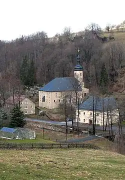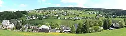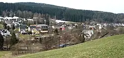 Rittersgrün is not one of the woodland villages typical of the Ore Mountains, as the rocky subsoil hardly allowed for agriculture.[3] The starting point for the settlement of the valley section was the hammer mills located on the Pöhlwasser. While the houses on the left side of the river are mostly grouped along the S 271, the scattered settlement on the Hammerberg above the former Rothenhammer forms the settlement core on the opposite side.