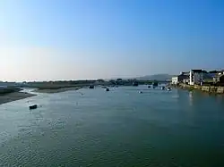 Beeding Bridge carries a minor road from Upper Beeding to Bramber over the river, while a little further south, the A283 Steyning By-pass crosses. A footbridge carries the Downs Link over the river, as the former railway bridge near Coombes has been demolished. The river continues through a gap in the South Downs near Lancing College where the Adur is fed by the Ladywell Stream, and is then crossed by the A27 Shoreham By-pass.[5] Further downstream is Old Shoreham Bridge, a Grade II* listed structure originally built in 1791. It is 500 feet (150 m) long, with 27 spans, and although it was largely reconstructed in the early 20th century, it is still of great interest, because it is probably the only one of its type which still exists.[8] The towpaths end at Old Shoreham Bridge, and the river becomes part of Shoreham Harbour.[9] The West Coastway Line railway bridge and the A259 Norfolk Bridge cross the river before it turns to the east, to flow parallel to the English Channel at Shoreham-by-Sea.[5] A new swing footbridge was constructed in 2013, linking Shoreham to Shoreham Beach. Replacing a previous structure which was beyond economic repair, it cost £10 million and was opened by the Duke of Gloucester.[10] It was named the Adur Ferry Bridge after a public vote was held.[11] The river enters the English Channel at Shoreham. The mouth of the Adur is now two miles (3 km) from the town centre of Shoreham due to longshore drift. Previously, the river mouth was further east, in Portslade, but an opening to the sea was made which allowed the creation of Southwick Ship Canal.