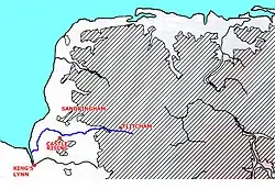 The river now crosses into fen and marshland and passes under the disused railway bed of the Lynn and Hunstanton Railway that ran from King's Lynn to Wolferton and once carried many members of the royal family on their way to Sandringham. The river now meanders in a northerly direction towards The Wash. It then switches into a man-made course that directs it southward through Wootton Marsh towards Vinegar Middle where the river finally runs into the river Great Ouse estuary at Lynn Channel.