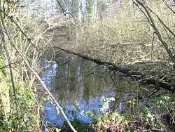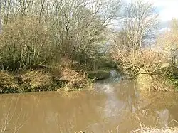 Several springs feed into the headwaters of the River Bourne and there are three contenders for its actual main source. It could be a spring on the North Downs at New House Farm, Yaldham, though the Environment Agency prefers a spring to the west of Oldbury Hill. It could be a spring on Oldbury Hill which feeds the Waterflash, a tree-ringed pond, which drains to the north of the hill. Oldbury Hill is on the Greensand Ridge. These merge in Ightham where the Bourne has cut a 117 feet (36 m) deep gorge through the limestone. In 1891 ice age relics were found near here in a quarry. The river passes through woods to Basted, where a mill pond gives clues to its industrial past. From Ightham through Hadlow to Golden Green, the river powered numerous watermills. Road names are full of mill references. The principal products were flour and paper. The area of the Medway Valley near East Peckham is prone to flooding and the River Bourne contributes much water, so is regularly monitored and dredged to ensure an uninterrupted water flow. There is a gauging station at Hadlow (TQ 632 497 51°13′23″N 0°20′17″E / 51.223052°N 0.338094°E).[3][4][5][6]