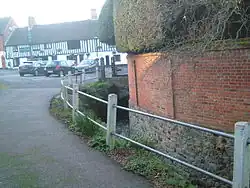 Golden Green is a hamlet within Hadlow parish. A mill may have been on this site since Domesday. This Grade II listed[21] mill is the only mill on the Bourne to retain most of its milling machinery. The internal waterwheel is of iron, and is breast shot. It is 14 feet (4.27 m) diameter and 7 feet (2.13 m) wide. on a cast iron axle. The pit wheel is 10 feet (3.05 m) diameter and has 120 cogs, driving a 2 feet 6 inches (760 mm) diameter wallower with 35 teeth on a 17 inches (430 mm) diameter wooden upright shaft. The Great Spur Wheel is 6 feet 8 inches (2.03 m) diameter and has 92 cogs. The date 1848 is on a plinth at the bottom of the Upright shaft, and may indicate the date of the existing waterwheel and machinery. The crown wheel was used latterly to drive the electricity generator, with one of the stone nuts being adapted as the driven gear. The mill had two pairs of millstones and last ground corn c.1920. The sack hoist does not survive. In the early-mid 20th century, the mill was used to generate electricity, but the apparatus has now been removed. The mill was also known as Bourneside Mill and Victoria Mill (Victoria Road is downstream of the mill). The outbuildings around the mill have been converted into holiday cottages.[3][11][22]