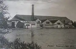 This paper mill was marked on Hasted's map and known to be in operation in 1716. It may be the paper mill at Wrotham which William Quelch was working in the period 1723–31.[8] The mill pond was 175 yards (160.02 m) long and 75 feet (22.86 m) wide at the mill, giving an area of 4,375 square yards (3,658 m2). George How Green was the occupier of the mill in 1835 when he leased Hamptons Paper Mill. The mill burnt down in 1917 and was rebuilt and worked by steam power until 1960. It finally closed after damage suffered in the floods of September 1968. The mill supplied paper used for postage stamps. Although often referred to as being in Borough Green, the mill site actually stands within the parish of Platt.[1][3][9][10][11]