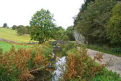 Just after the road bridge, Bleakley Dike joins on the right bank. The dike rises in Bleakley Plantation and flows northwards to enter a "V"-shaped pond,[15] known as Harthill Pond, which has historically been known as Spar Lake, Miners' Lake,[16] and more recently Youlgrave Dam.[17] A second stream flows into the other branch of the "V" from the south-east. There is a sluice on the outlet of the pond, which is labelled Fish Pond on the 1:2500 map. From the pond the dike flows to the north-west to reach the River Bradford. After the junction there is a wide bridge carrying a public right of way, called the Old Coach Road.[15] A former packhorse bridge with a single arch of limestone rubble and gritstone copings crosses the Bradford to the south of the hamlet of Bradford. It dates from the 18th century and is grade II listed.[18] This is followed by five more weirs, a bridge which enables the Old Coach Road to cross back to the left bank with a weir immediately below it, and then the River Lathkill joins on the right bank at Alport. Both rivers flow over a weir, and the combined flow is called the River Lathkill below the junction.[15]