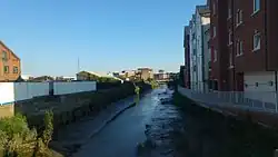 It then meanders under a road bridge at the bottom of North Hill, and tumbles down a weir used for discharge control at Middlemill, the site of a now-demolished mill. It forms the border of Colchester's Castle Park and the cricket ground, and footbridges cross it to provide access from the town centre to residential areas on the north side of the flood plain, which occasionally floods should the river rise too much. The river encircles one side of a small lake, and then turns south-east, and then south, before falling over a large weir and becoming tidal.