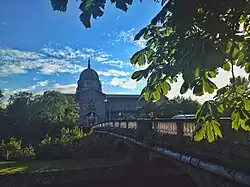 The part of the river that flows from the southern end of the lake to the Salmon Weir is known as the Upper Corrib. The weir, a set of weir gates also built during the above navigation scheme, was originally built from stone and timber but now only two of these gates remain and are only opened in times of flood. The rest have been replaced by fourteen steel gates, as shown in the photograph above.