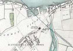![]() 1830 map of Battersea, showing a Mill Pond (bottom right) fed by the River Heathwall, where it goes to join the Thames | |