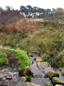 The River Hipper rises as a small stream known as the Hipper Sick close to the 1,120-foot (340 m) contour on Beeley Moor or East Moor, just inside the Peak District National Park. As it flows eastwards, it is joined by a number of similar drains, flowing southwards across Brampton East Moor, and is crossed by Longside Road, where it leaves the park and enters some woodland. It turns to the south-east, and briefly defines the border of the park as it approaches Harewood Grange. It is crossed by Harewood Road, and is joined by two more streams, flowing north-east across Harewood Moor, the first unnamed and the second called Millstone Sick. It then resumes its easterly course through woodland known as Cat Hole, is crossed by Hungerhill Lane, flows over a weir adjacent to Hunger Hill Pumping Station and turns to the north-east to reach the eastern edge of the village of Holymoorside. It feeds the Old Mill Pond, and is joined by another stream, which rises a little further to the north-east than Hipper Sick near Upper Loads, and flows eastwards through Nether Loads to reach Holymoorside. The combined stream passes under Cotton Mill Hill, and heads towards Chesterfield.[7]
