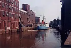 Scott Street Bridge had gradually deteriorated, and a public consultation was held in 1986, to determine its future. By that time a 10-ton weight limit had been imposed on traffic using the bridge, because of its poor structural state. Three suggestions were made as to its future. These were to close and demolish it, to refurbish it at an estimated cost of £1.6 million, and to build a new bridge on the same site but a different alignment, to eliminate the awkward turn at the west end, which was costed at £2 million.[80] None of these actions have been taken, as the bridge leaves were raised in 1994, and have remained raised ever since. Consideration was given in 2007 to preserving two of the hydraulic rams which operated the bridge, during planning to demolish the structure. The Hull Hydraulic Power Company was set up in 1872, and by 1876 was operating a pumping station on Machell Street. This supplied water to a high pressure main which ran from Wellington Street to Sculcoates Bridge, and was used by local industries to power machinery, including the bridge when it was constructed. Although the power company closed in the 1940s, it made Hull the first city in the world to have a public system of power distribution.[81]