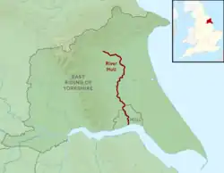 The lower river was bordered by salt marshes in medieval times, when efforts were first made to drain them. Further upstream, channels were cut through the fens in the twelfth and thirteenth centuries by the monks of Meaux Abbey, primarily to enable travel by boat, but these gradually became part of the drainage system.[12] John Smeaton, when asked by the merchants of Driffield to advise on ways to allow keels to reach their town, suggested a small cut of about 1.2 miles (1.9 km) including one lock, from the river near Wansford. The merchants sought a second opinion, and John Grundy, Jr. suggested a much longer canal, running for 5 miles (8.0 km) from Fisholme on the Frodingham Beck. When fully opened in 1770, the new route was some 3 miles (4.8 km) shorter than the river, which follows an extremely winding course in its upper reaches.[7] The river above Aike was now considered to be part of the Driffield Navigation, and tolls were charged for its use.[4] Also in this period the first cut of the Holderness Drain was made, enabled by an act of Parliament, the Holderness Drainage Act 1764 (4 Geo. 3. c. 47 Pr.), originally outfalling onto the river. In addition to the drainage works to the east of the river, the banks were raised for 17 miles (27 km) on the east side, to prevent flooding.[14][15]
