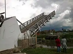 In 1925 plans were submitted for a new bridge; of which one costed at £275,000 with a straightened approach road approximately 30 yards (27 m) north of the 1870 bridge was accepted.[51][53] The bridge was contracted in 1927 for £86,100 to the Widnes Foundry (1295) Ltd,[54] who constructed as a Scherzer rolling lift bridge (or "Walking lift bridge"). The bridge was Grade II listed in 1994.[55] |