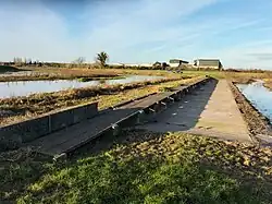 In order to isolate the river from Hatfield Chase, a barrier bank was constructed along the northern edge of this channel, for 5 miles (8 km) from the dam to West Stockwith. A navigable sluice was built about 1 mile (1.6 km) from the river mouth at Misterton Soss by Vermuyden's nephew, John Liens, between 1629 and 1630, to prevent water from the Trent flooding the land to the south of Bycarrs Dike. The construction was of timber, with high banks running to the Trent on both sides of the channel. Lifting gates gave access to a lock chamber 60 by 18 feet (18.3 by 5.5 m), which could be used when the Trent was not in flood.[15] Liens was compelled to carry out the work by the Court of Sewers, to prevent the flooding of Misterton and Haxey Commons.[14]