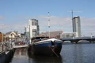 In the late 19th century the Lagan Canal was built from Lough Neagh to Belfast, using some of the river as a navigable waterway and diverting water from other areas to supply separate canal sections.[5] However, by the mid-20th century the route had fallen into disuse and was largely derelict. The M1 motorway (Northern Ireland) was built across a large section of the route. Currently, the section of the navigation's towpath running from Lisburn to the centre of Belfast has been restored. A section of National Cycle Route 9, which will eventually link Belfast with Dublin, follows this towpath.